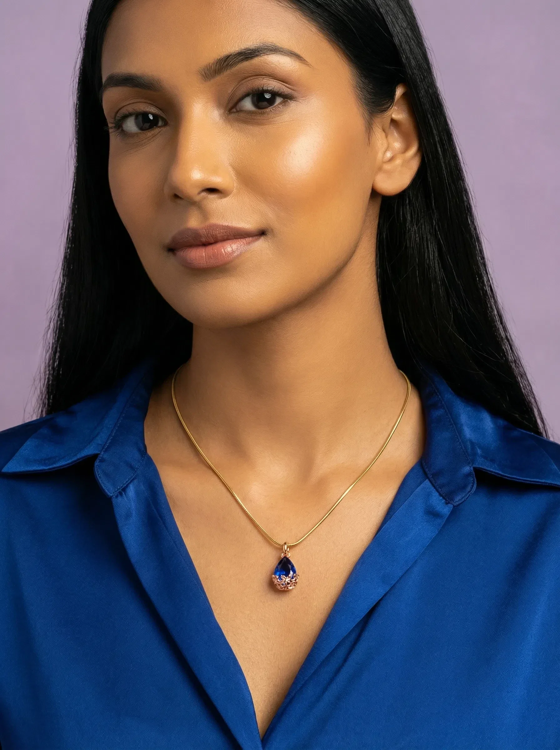 Deze verfijnde hanger is uitgevoerd in een prachtige druppelvorm en gezet in een decoratieve goudkleurige kap met een subtiel pruimenbloesem design.