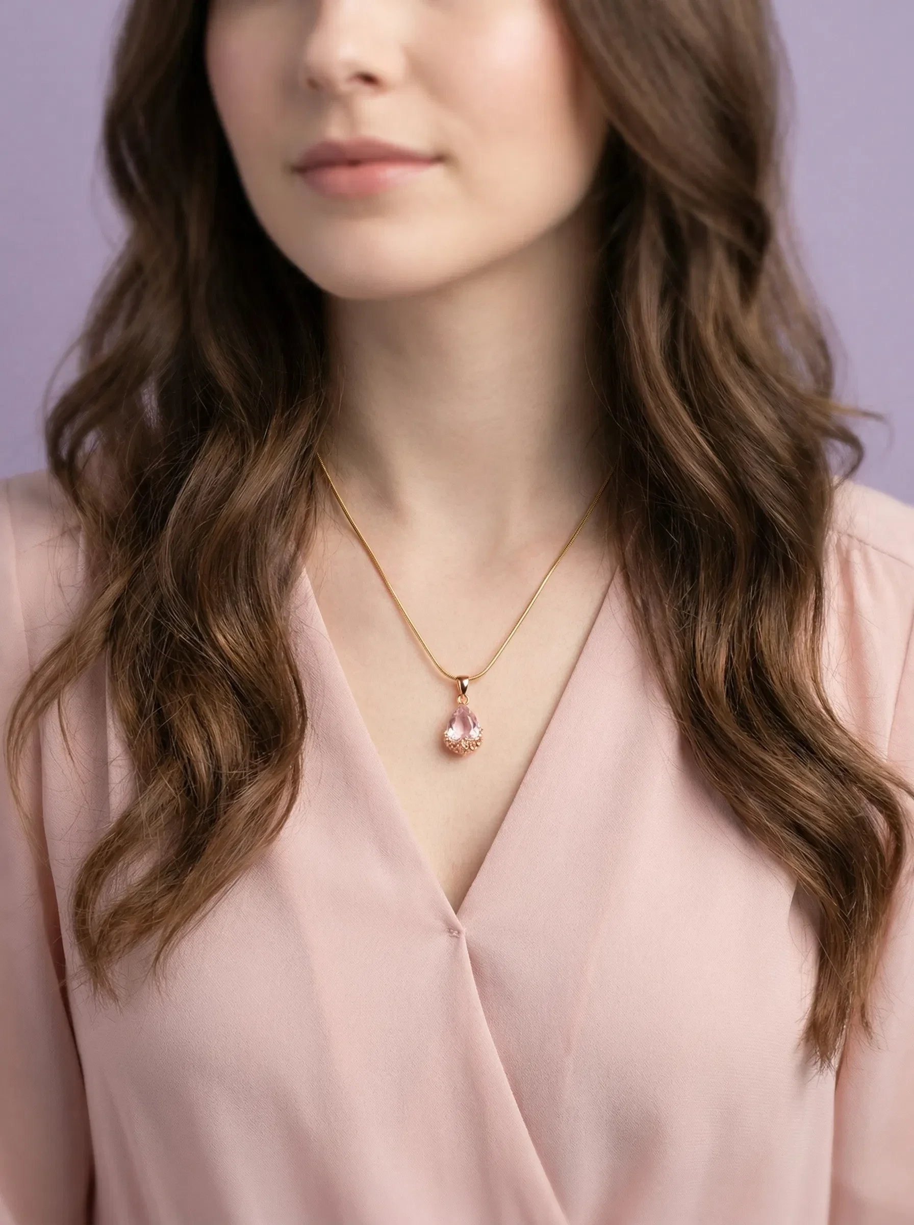 Deze verfijnde hanger is uitgevoerd in een prachtige druppelvorm en gezet in een decoratieve goudkleurige kap met een subtiel pruimenbloesem design.