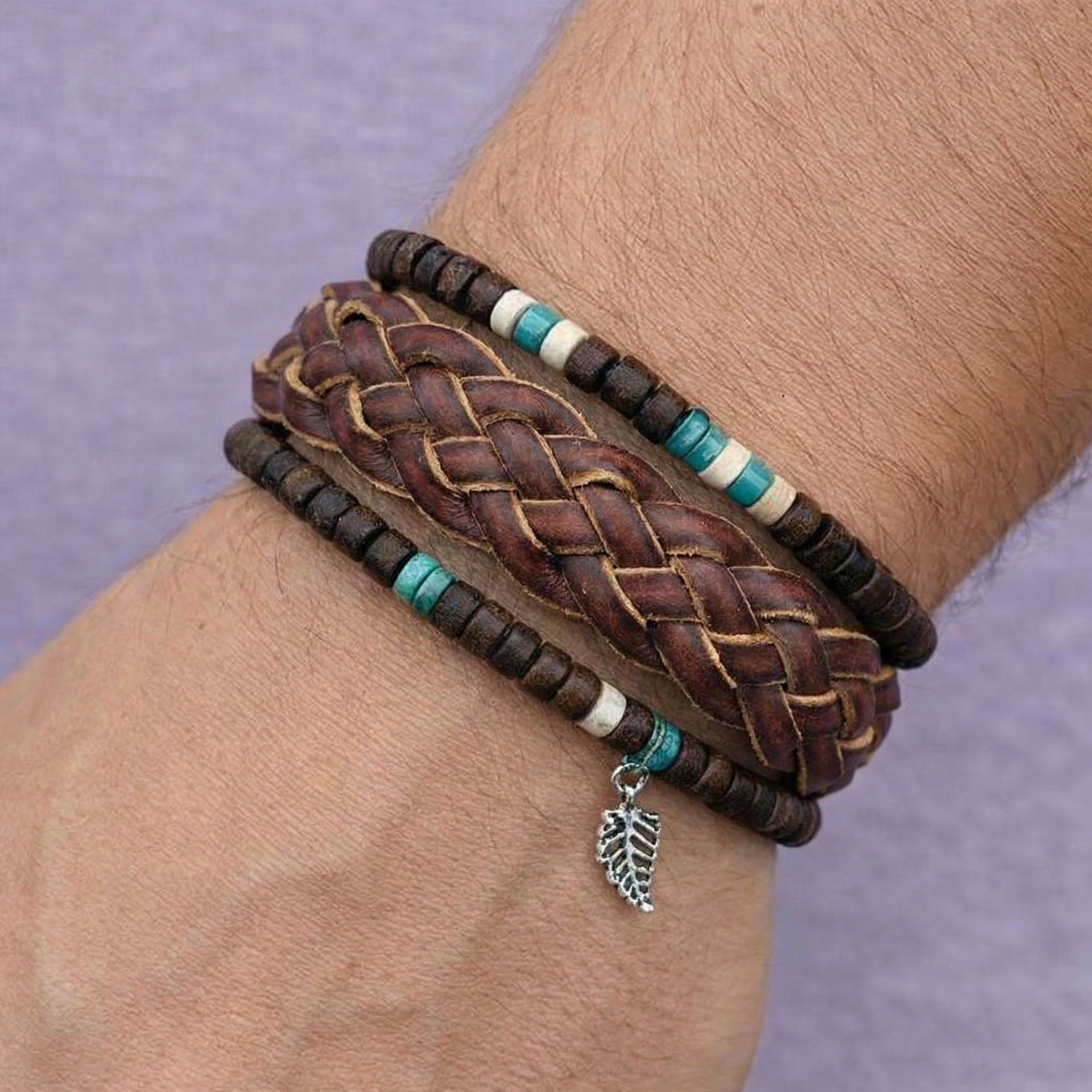 π€ Donkerbruine tinten met turquoise accenten en natuurlijke materialen. π€ Combinatie van hout, kralen en leer met een speelse uitstraling.